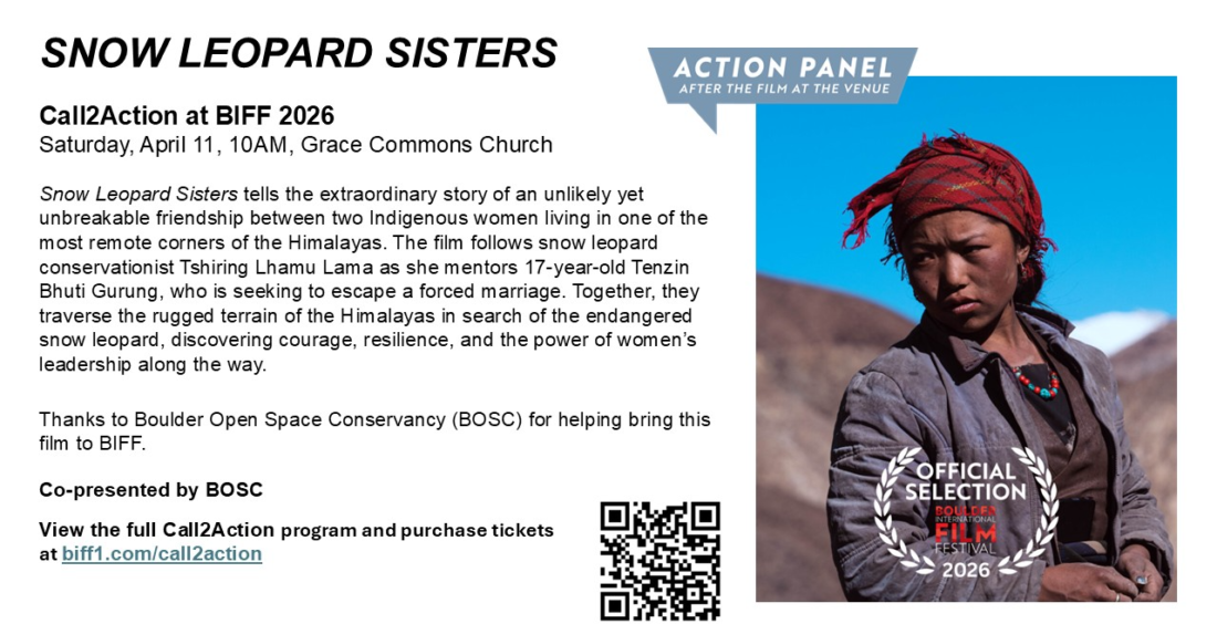 Boulder Open Space Conservancy is excited to be the Call2Action partner and co-presenter for the film, Snow Leopard Sisters at BIFF. The film will be showing Saturday, April 11th at 10:00am at Grace Commons 1820 15th Street Boulder. After the film, join us for a “Talk Back” panel Q&A and Call2Action for folks who were moved during the film to learn more or take action.